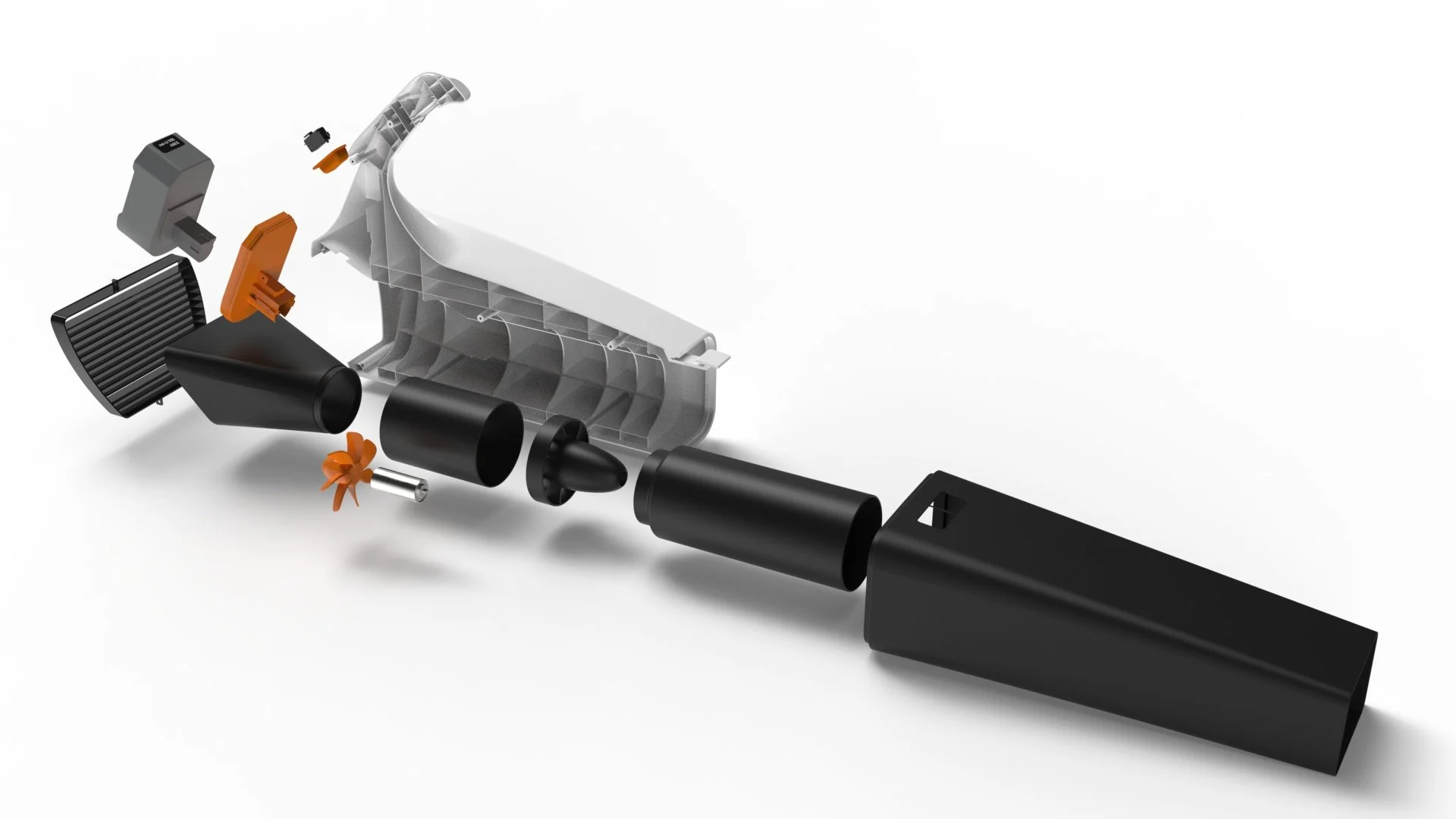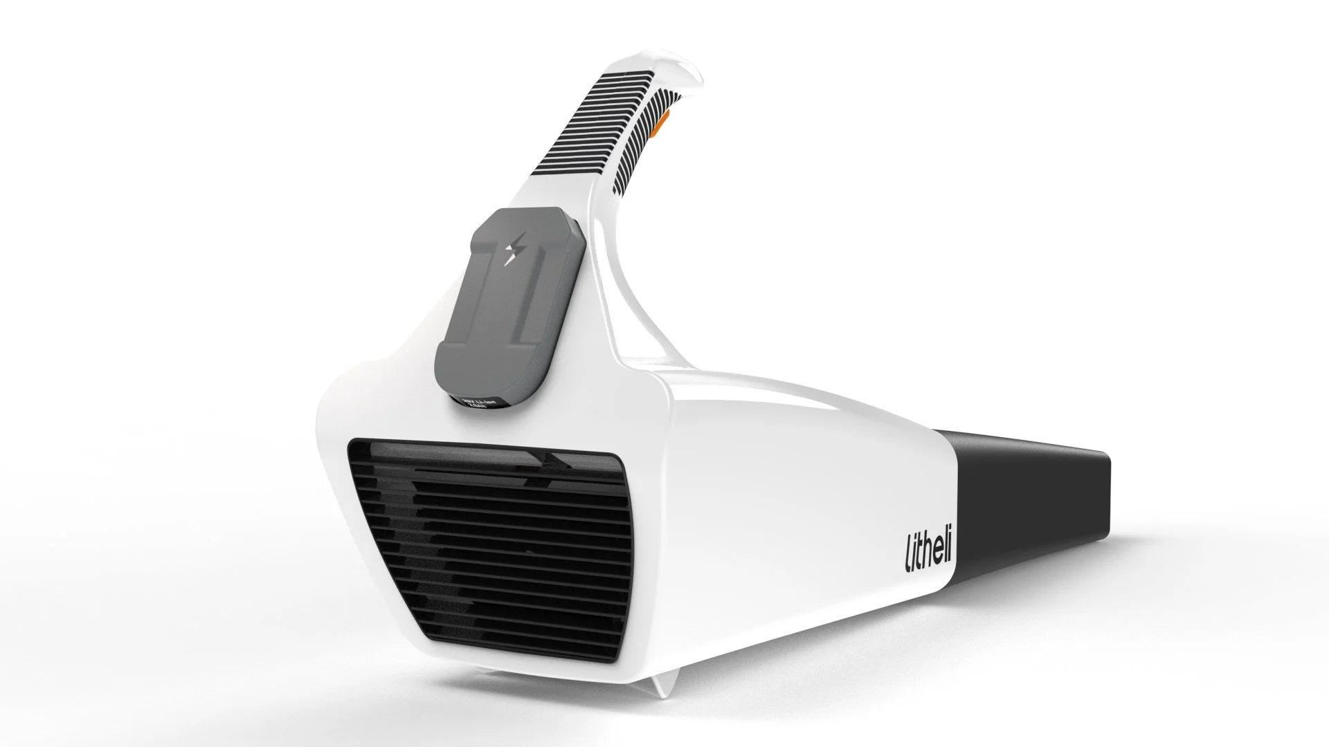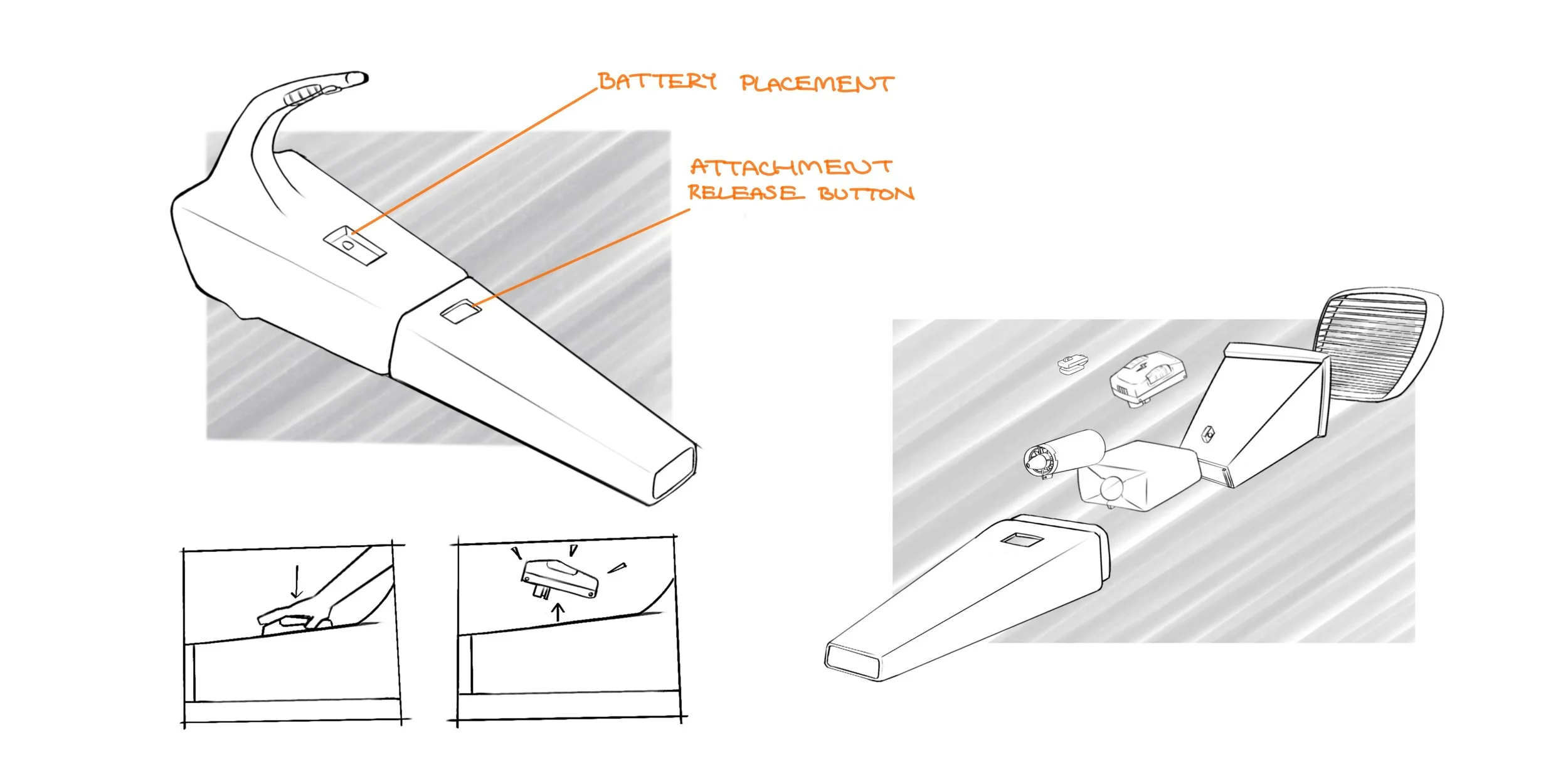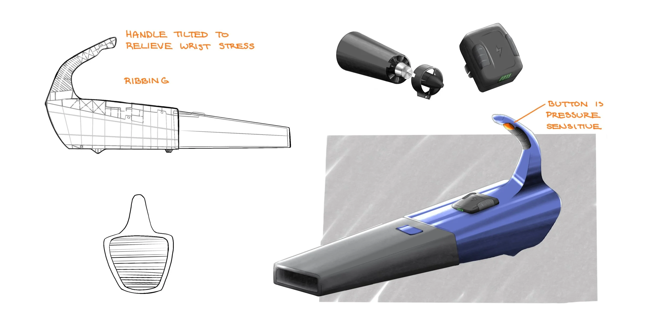 This concept featured a tilted handle for easier weight distribution and a battery that would release from the body after pressure was applied. However, examining the inner workings of the leaf blower revealed that the placement of the battery would need to be changed.