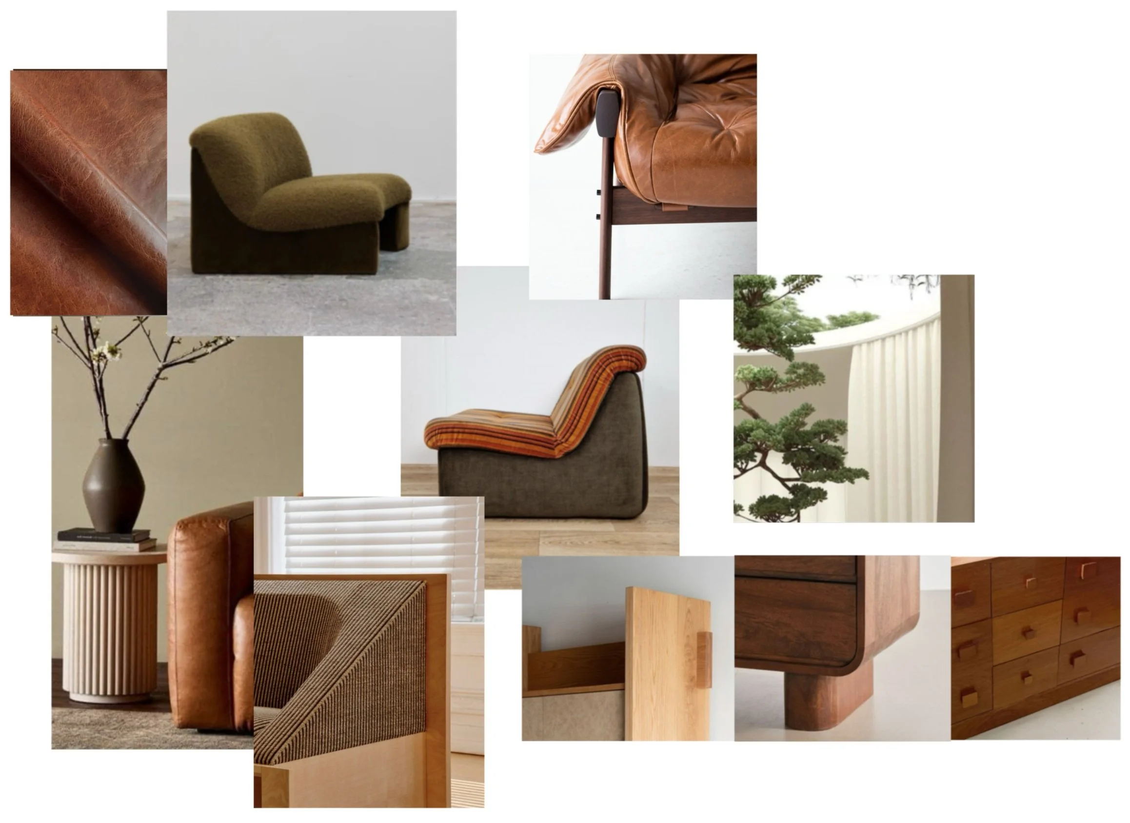 A mood board was created to foster a sense of clarity for how the furniture piece should feel. Emphasis is on natural materials such as exposed wood and leather, and an open and inviting feeling incorporated into the form.